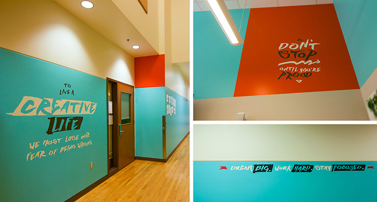 These graphics were created as part of the "FutureYou" initiative. Sports marketing students developed inspirational phrases which we then designed as murals.