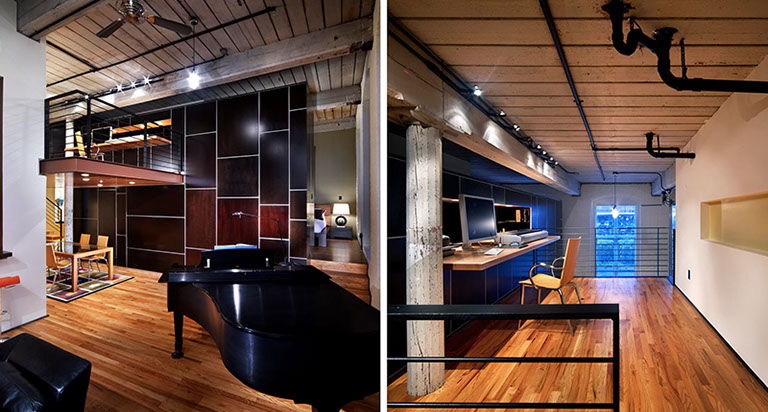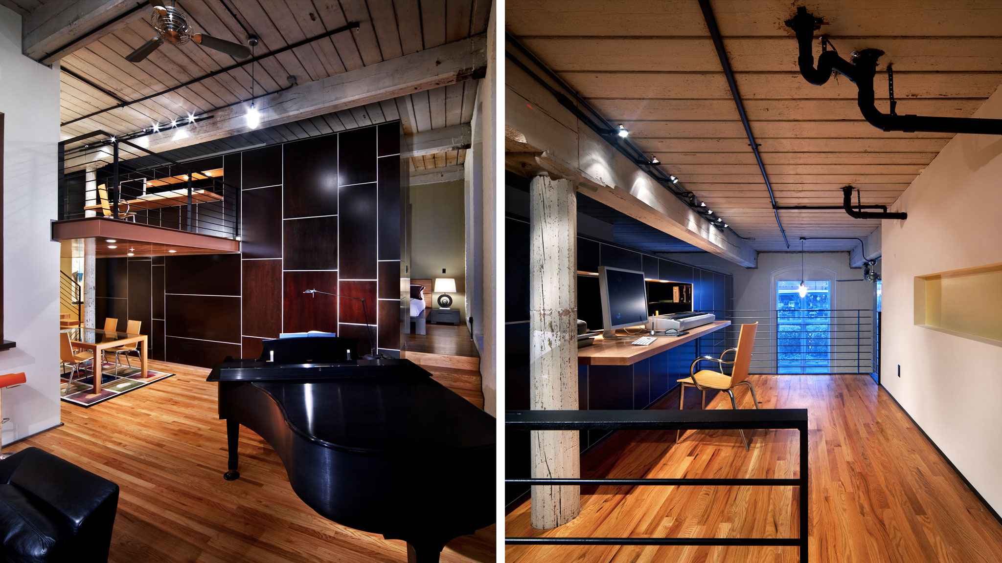 This project is the renovation of a single condo unit in an 19th century cotton mill in downtown Raleigh, NC. The existing space was a dark and dreary maze, and the design concept for the space sought to satisfy the owner’s needs without the use of conventional walls and doors. Utilitarian functions and storage are tightly organized within a single wood-clad volume that divides sleeping and bathing space from living/working spaces. The original mill building is celebrated by uncovering the original 1800’s brick and wood structure.