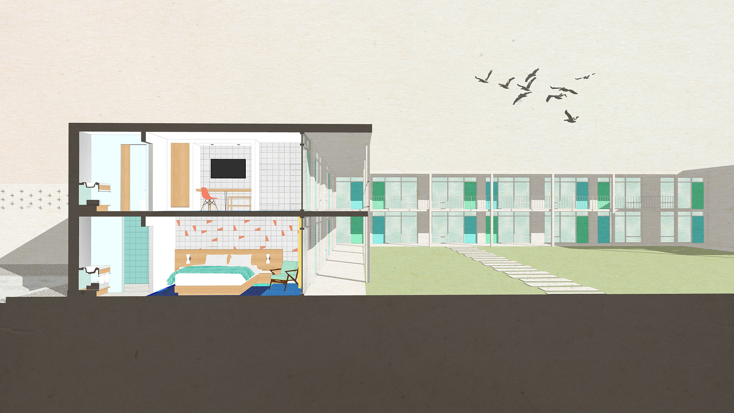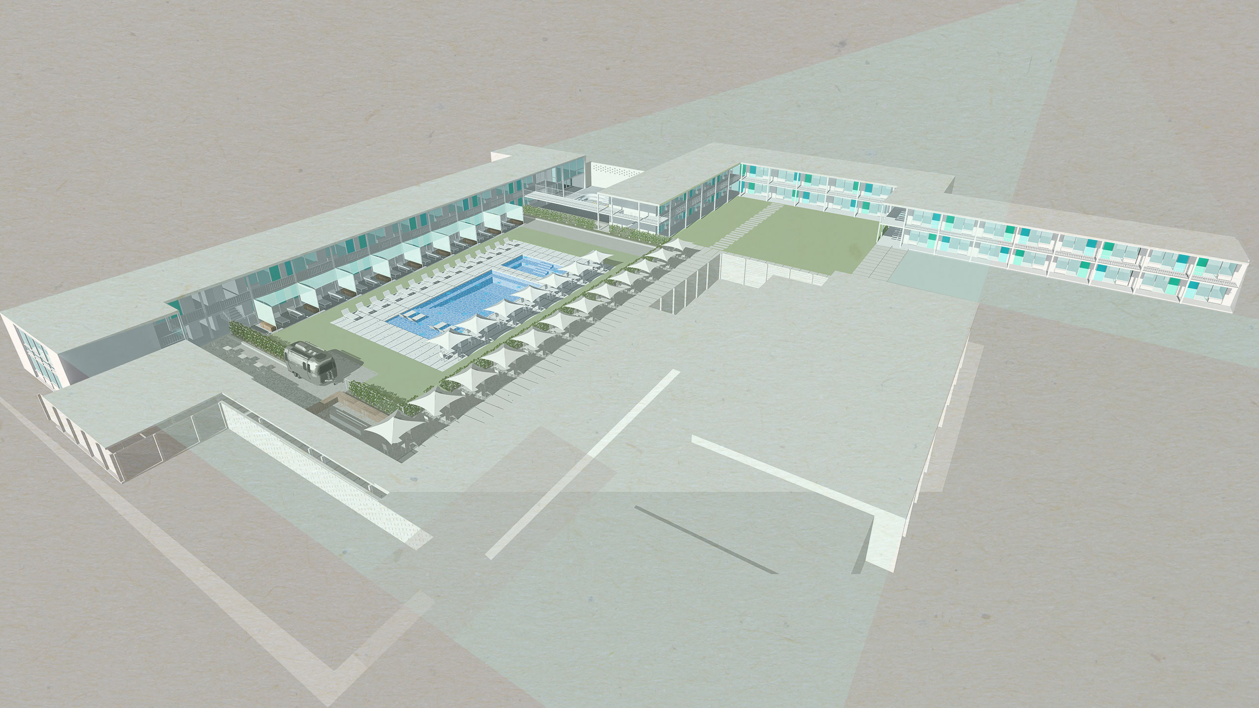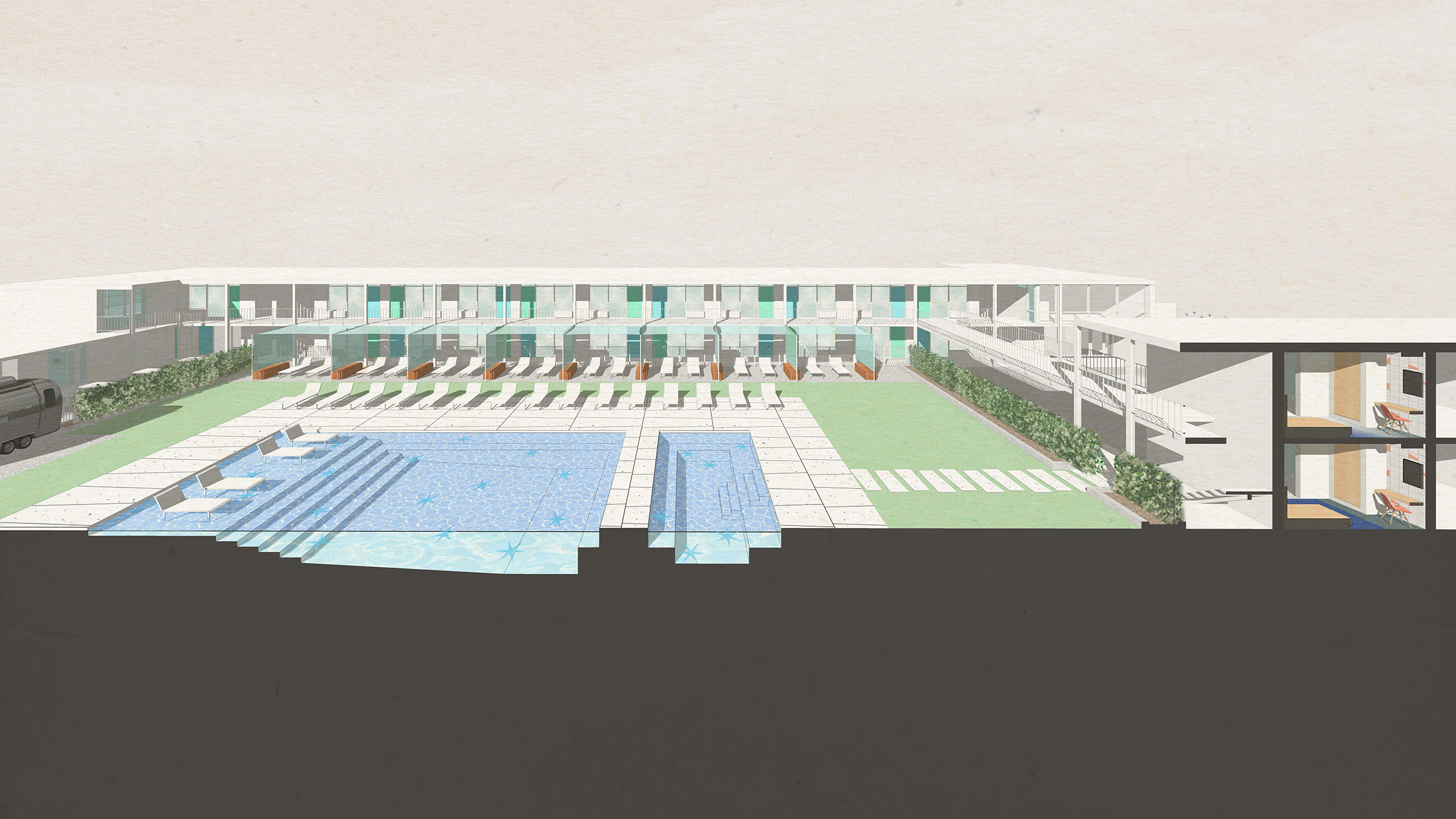 The hotel is updated for the 21st Century by relocating the motor-lodge style internal parking in order to create a private amenities courtyard for guests. The project is a joint venture with east coast-based Good Work Architects.