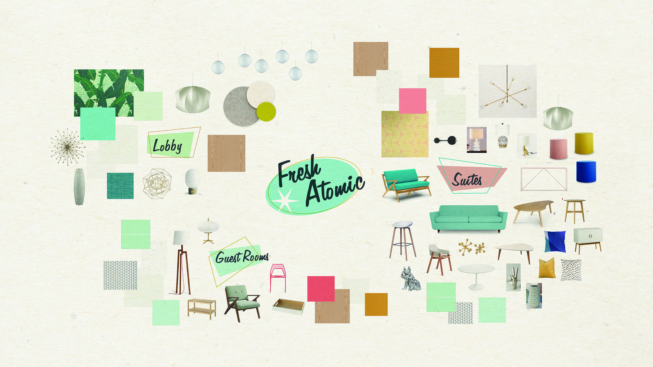 The interior design concept -- Fresh Atomic -- blends retro styled furniture and finishes with a contemporary minimalist aesthetic.